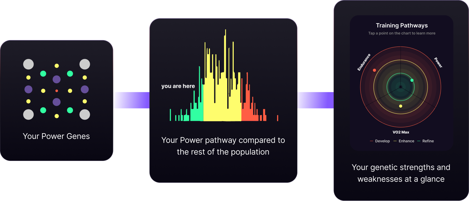 Our proprietary Darwin Pathway Analysis methodology considers the collective impact of multiple genes on crucial performance categories and employs machine learning to classify genetic strengths and weaknesses.
